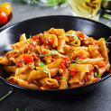 Penne pasta in meaty tomato sauce, adorned with tomatoes and pea sprouts