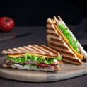 Two meat and cheese sandwiches with tomatoes between toasted bread