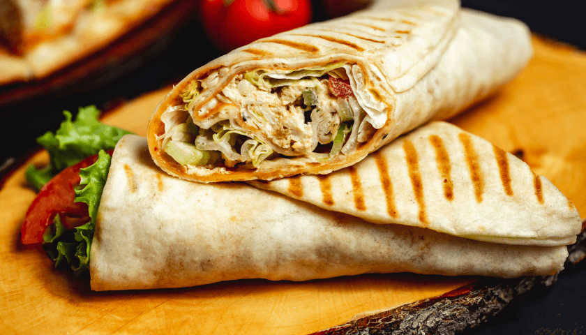 A chicken roll in pita with grilled chicken, lettuce, cucumber, tomato, and mayo