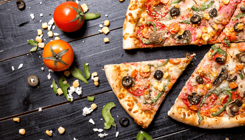 Penne pasta in meaty tomato sauce, adorned with tomatoes and pea sprouts