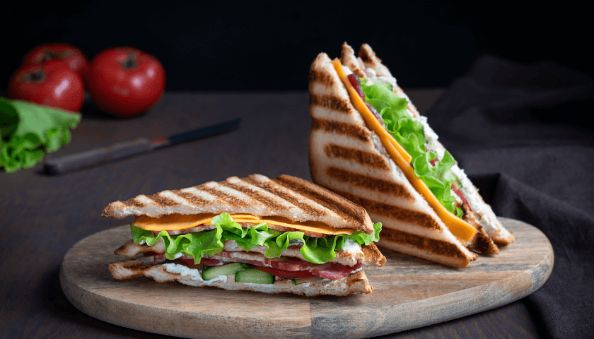 Two meat and cheese sandwiches with tomatoes between toasted bread